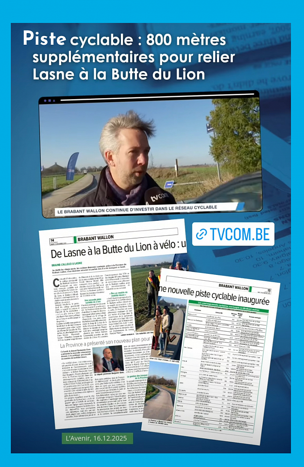 Ce lundi 15 décembre, un nouveau tronçon cyclable de 815 mètres a été officiellement inauguré par le Collège provincial du Brabant wallon, en présence de Laurence Rotthier, Bourgmestre de Lasne, ainsi que de Cédric Gillis, Échevin de la Mobilité.